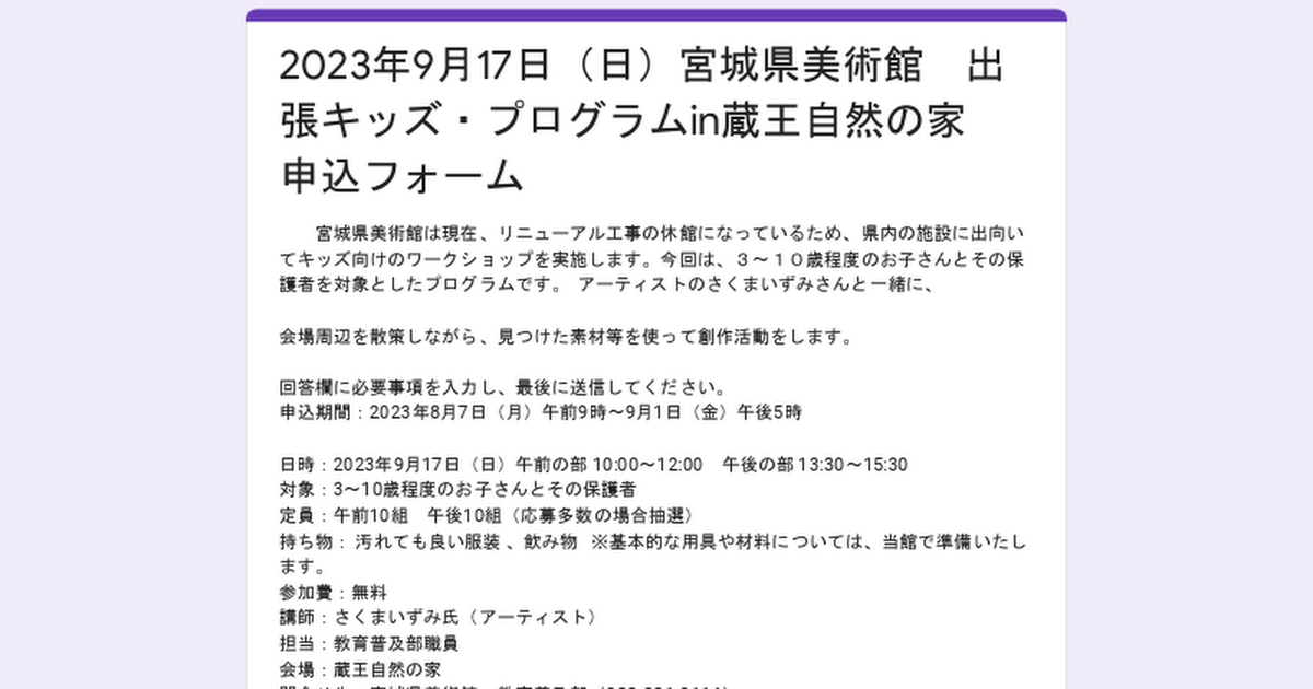 秋のイベントですが、スケジュールの都合がつく場合は宮城県美術館 出張キッズ・プログラムをチェックしてみてはいかがでしょうか?