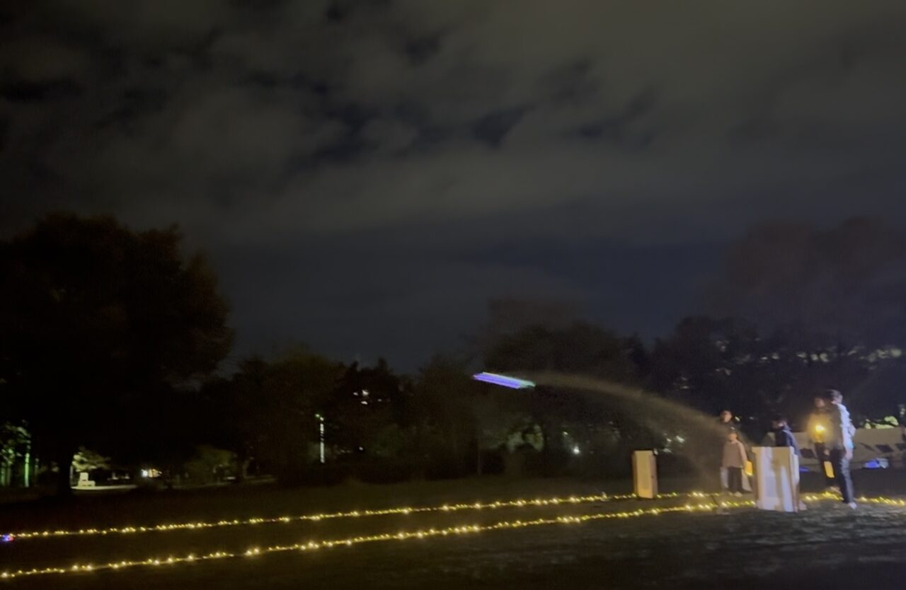 七北田公園で開催されているIZUMINATION会場で、夜の公園にカラフルに光るペットボトルロケットが飛ばせる企画をやっています。