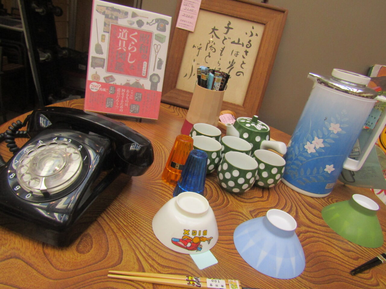 雑貨コーナーには黒電話や魔法瓶、グラス、生活道具みたいなものもありました。