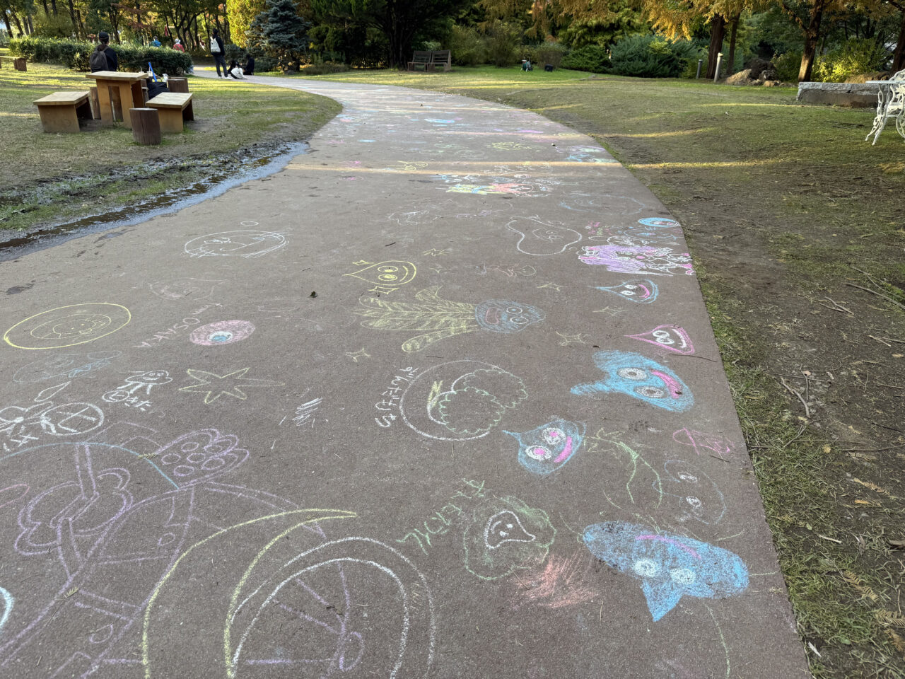 落書きOKのあの歩道にもチョークで描かれたたくさんのスライムたちがいました。