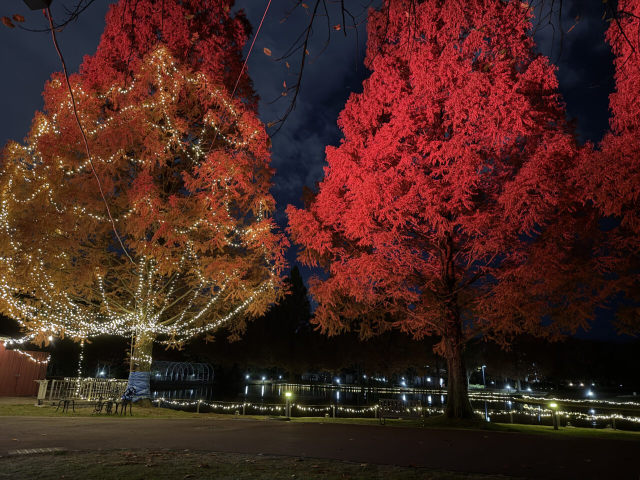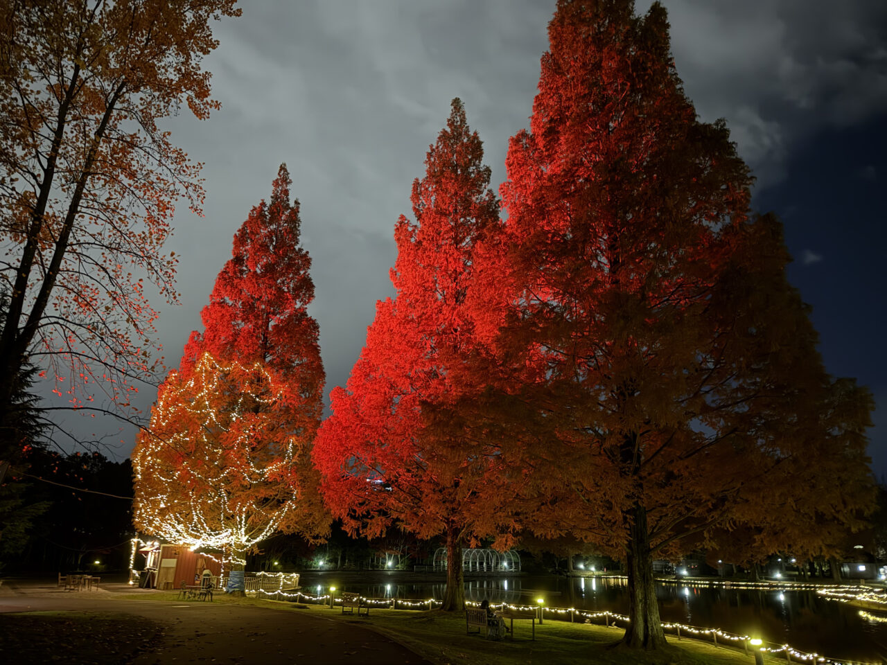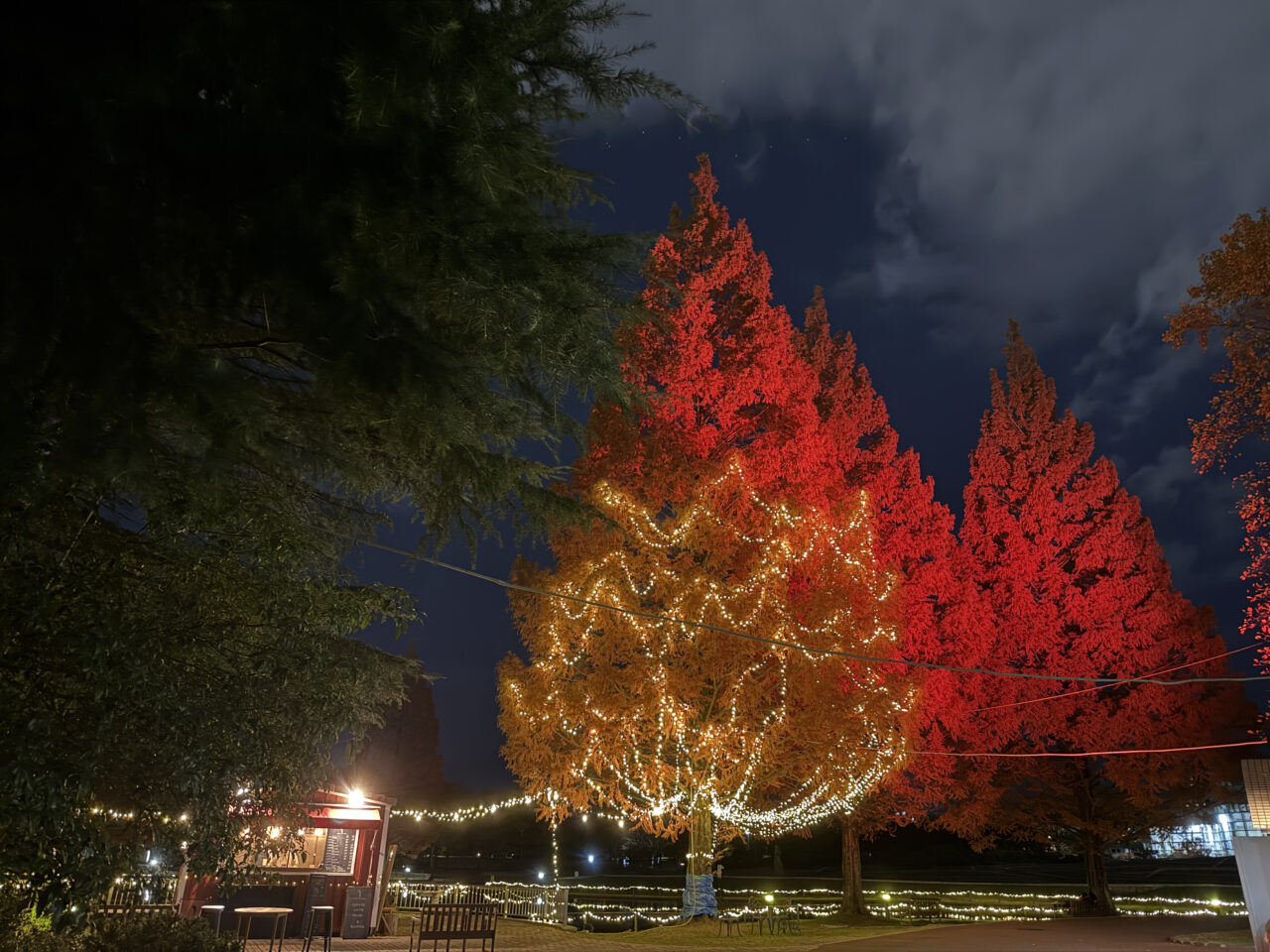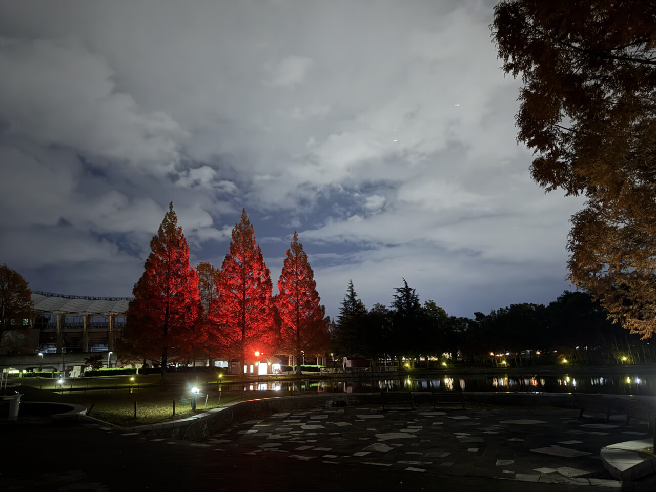 実は、七北田公園のNANA+ICHI CAFE前にあるメタセコイアの木がオレンジ色にライトアップされているんです。