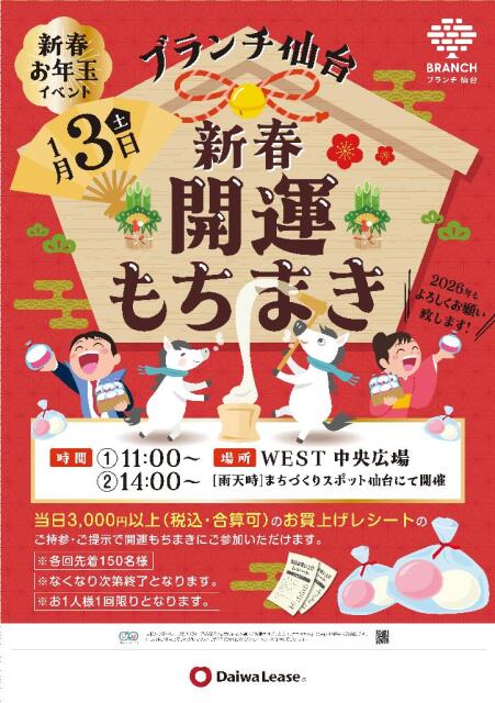 長命ヶ丘のブランチ仙台で、「新春開運もちまき」が1月3日(土)に開催されるようです!新年のおたのしみ、もちまきイベントが今年も登場ですね!