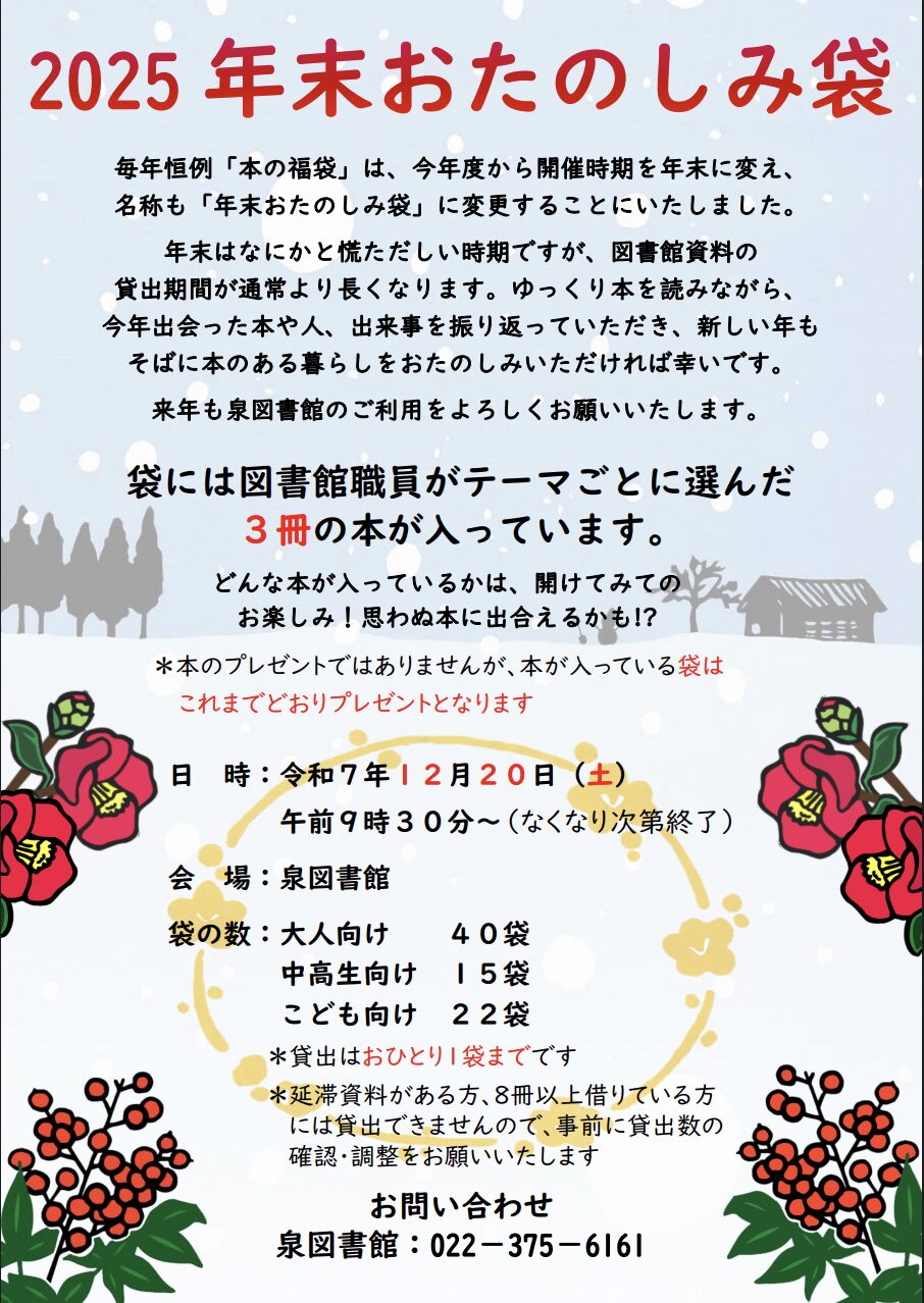 泉図書館で、毎年恒例だった「本の福袋」が今年から「年末おたのしみ袋」に名前を変えて、年末に実施されることになりました!