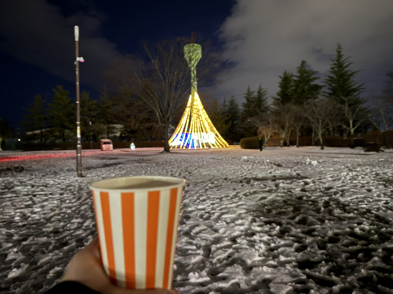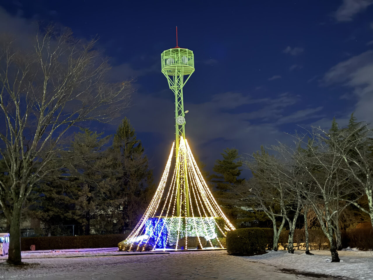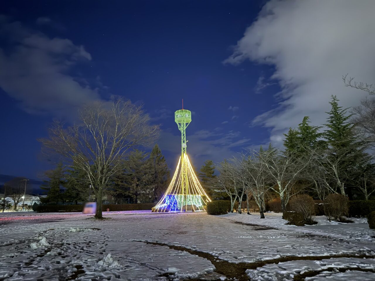 雪の中で始まった点灯イベント、愛の鐘タワーにイルミネーション!