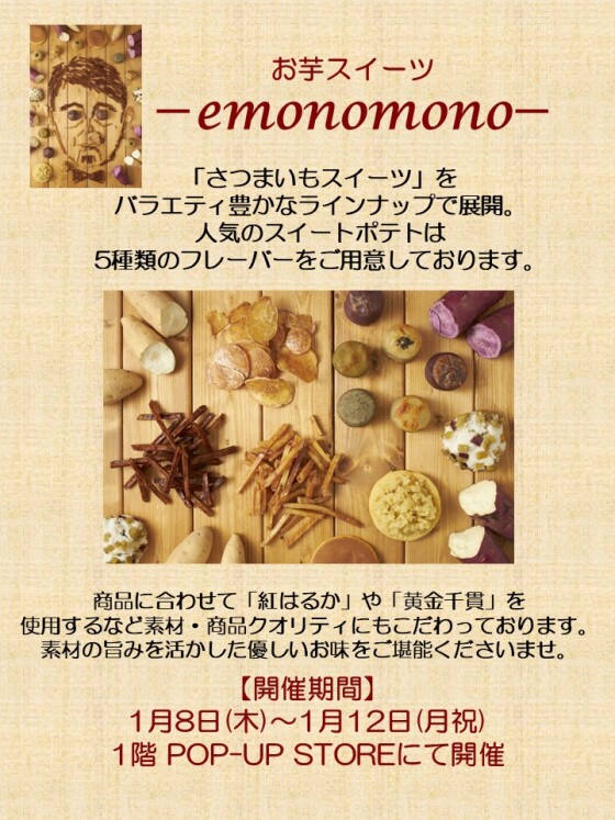 さつまいもを使ったスイーツブランド「emononomono」が、明日から期間限定で出店するみたいです。