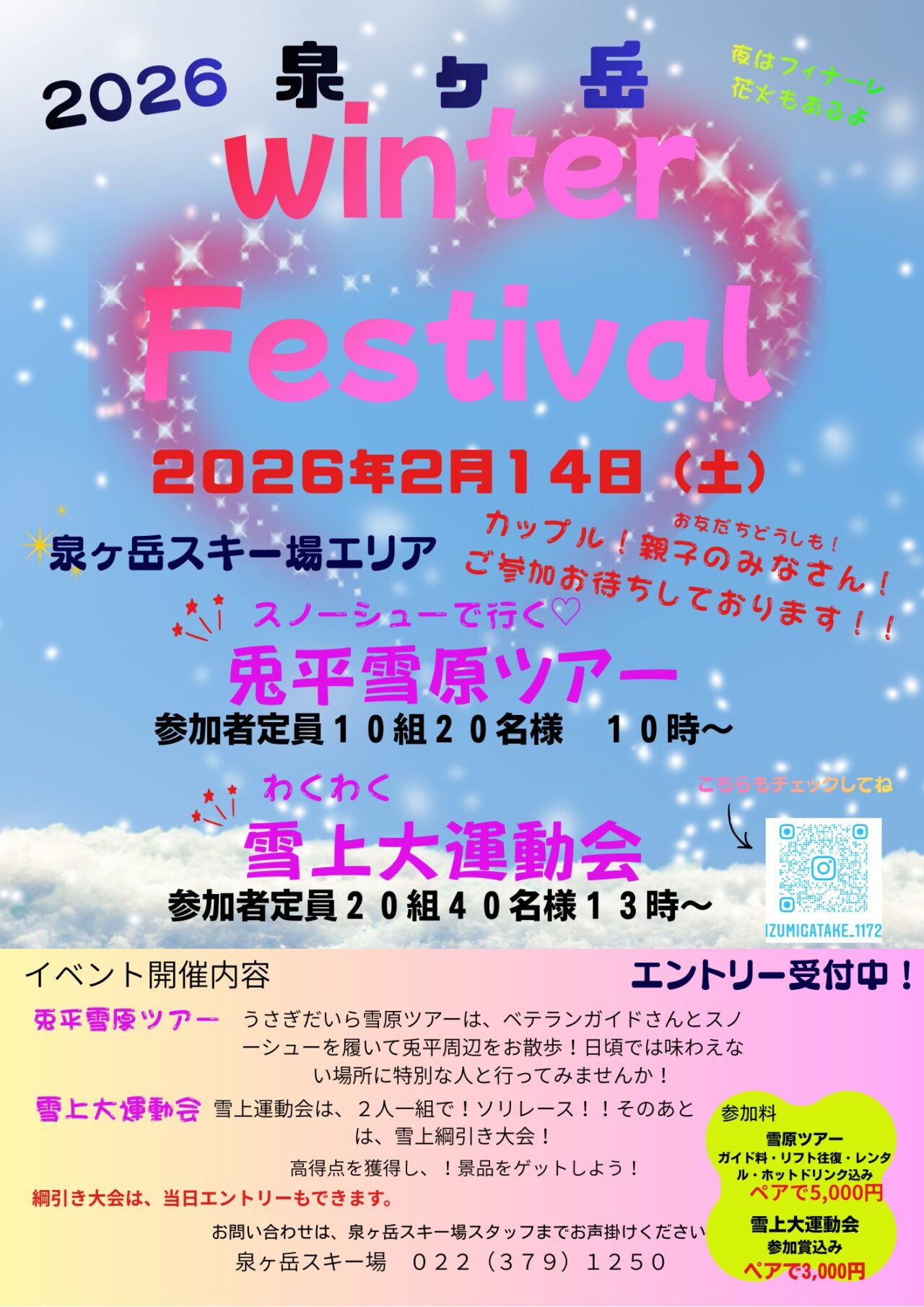 泉ヶ岳スキー場のあたりで、2月14日に「泉ヶ岳ウィンターフェスティバル」があるみたいです。