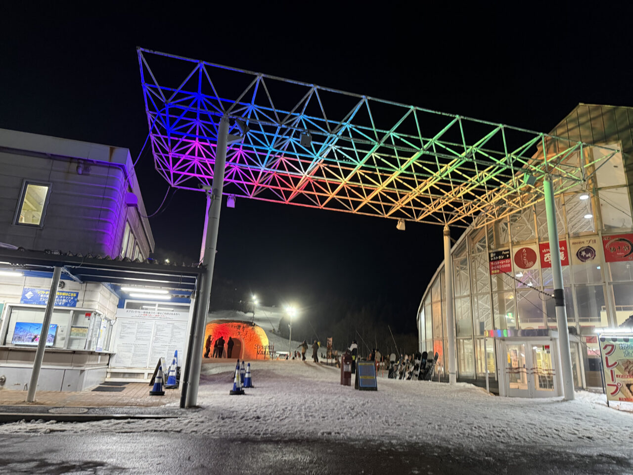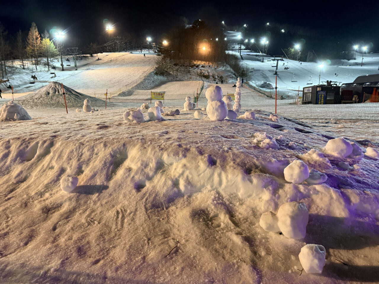 ナイターのゲレンデを背景に見るかまくらは、この時期ならではですね。