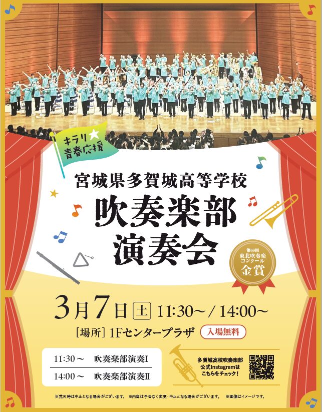 3月7日に、三井アウトレットパーク仙台港で宮城県多賀城高等学校の吹奏楽部による演奏会が開催されるみたいです。