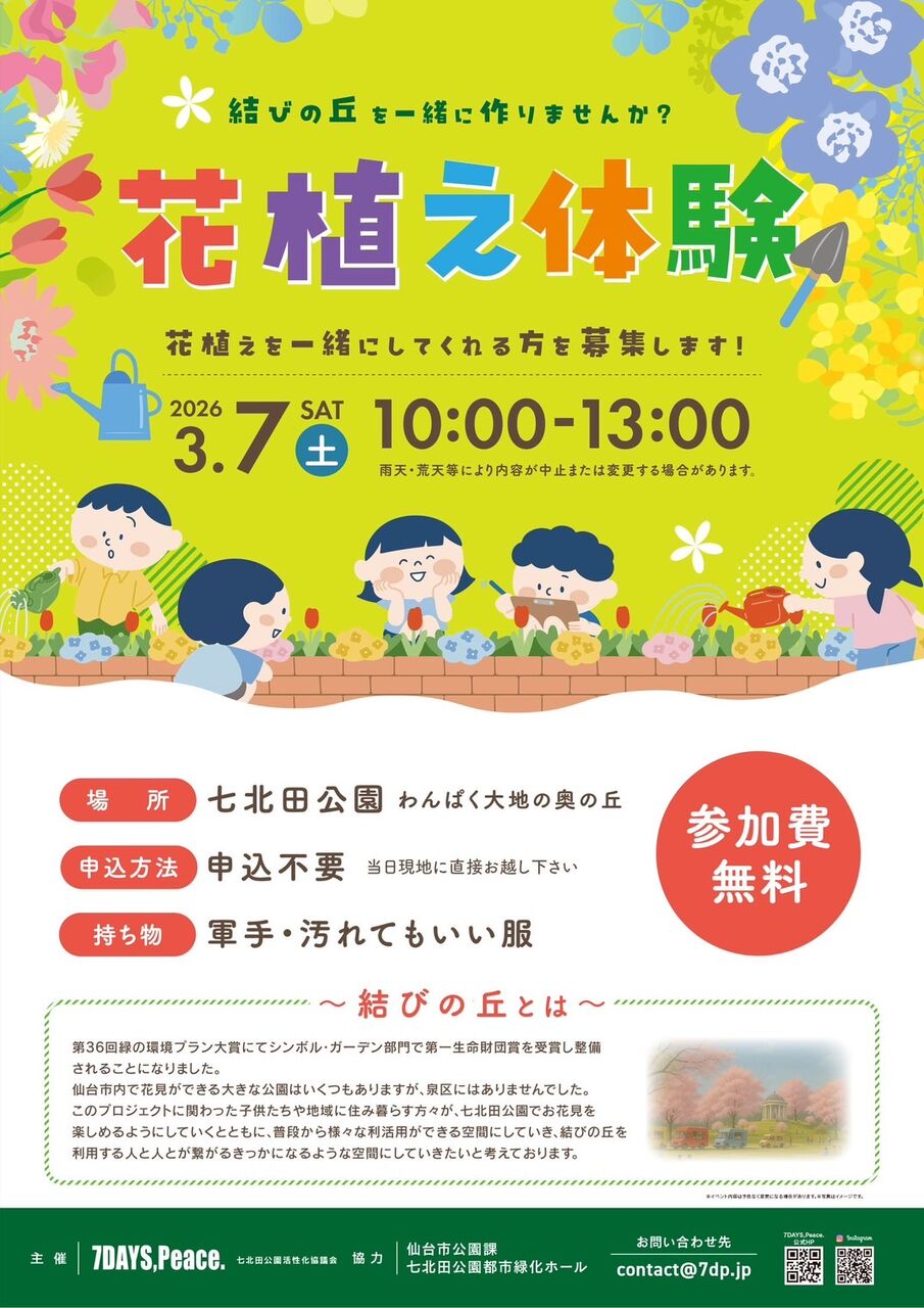 七北田公園で、3月7日(土)に花植えの体験イベントが開催されるみたいです。