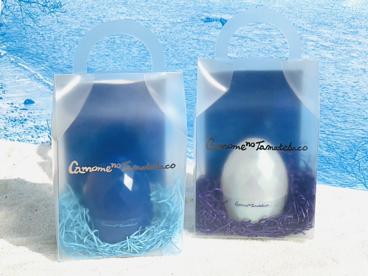 「かもめの玉手箱」って普段は常設販売してない希少な商品らしくて、この機会に数量限定で買えるみたい。宝石みたいなダイヤモンドカットの青い玉子型ケース、写真で見るとかなりきれいですね。