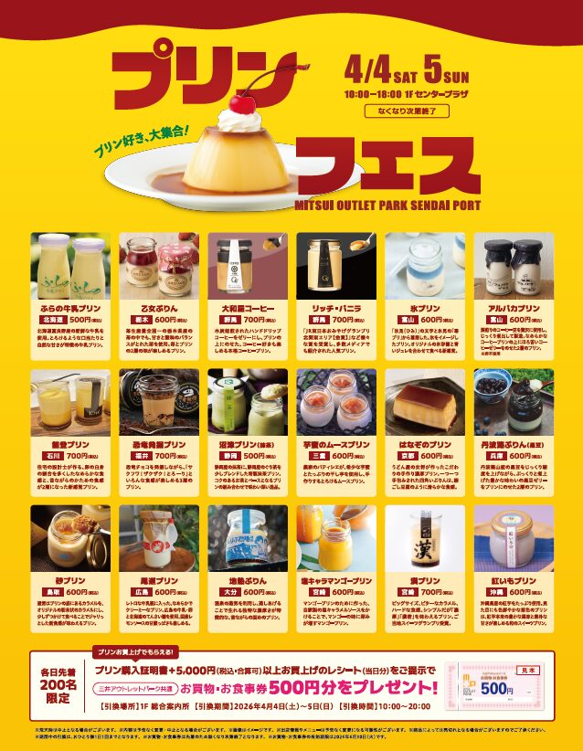イベントにあわせて、当日のプリン購入証明書と、館内での5,000円分(税込・合算可)以上のレシートを1F 総合案内所に提示すると、各日先着200名限定で「お買物・お食事券500円分」がもらえるみたいです。