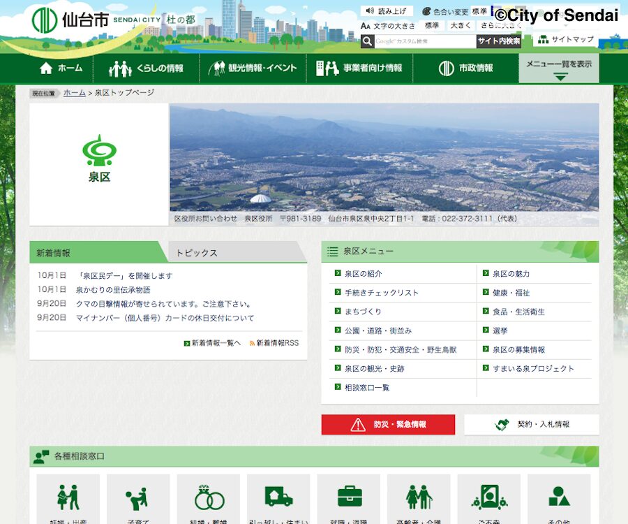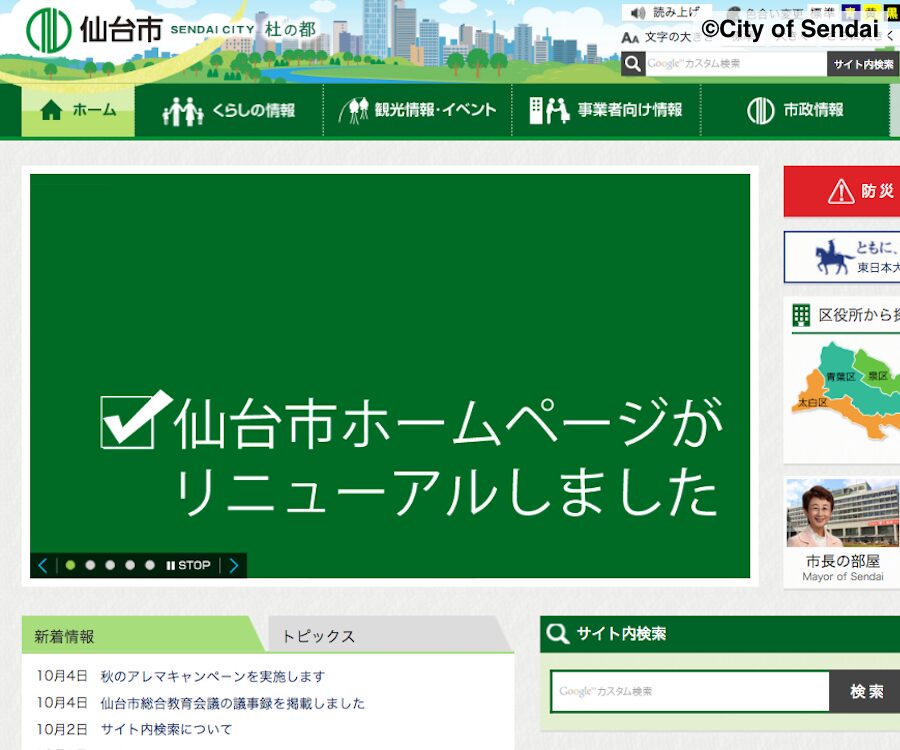 仙台市のホームページが9月後半にデザインを変更していたようです。