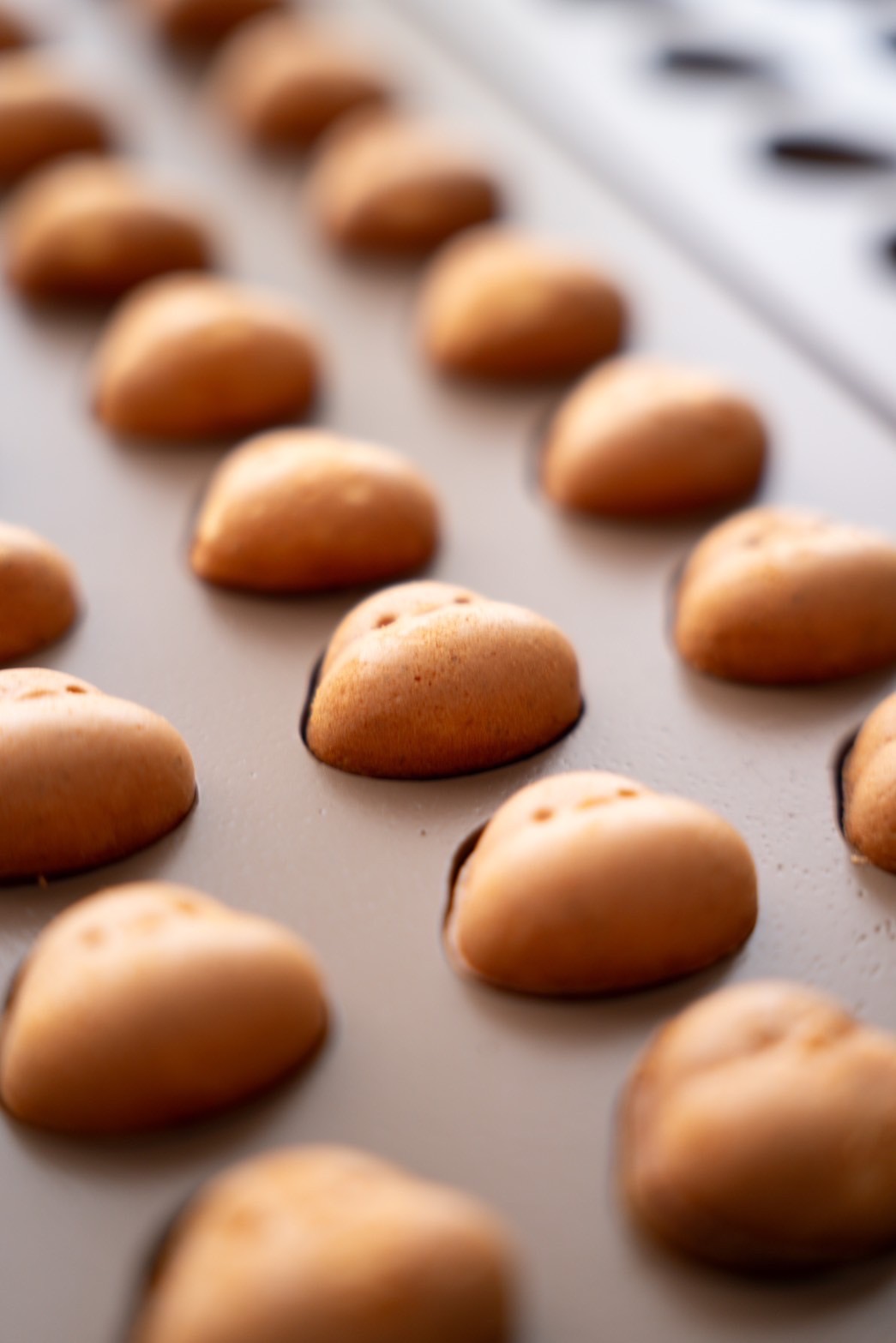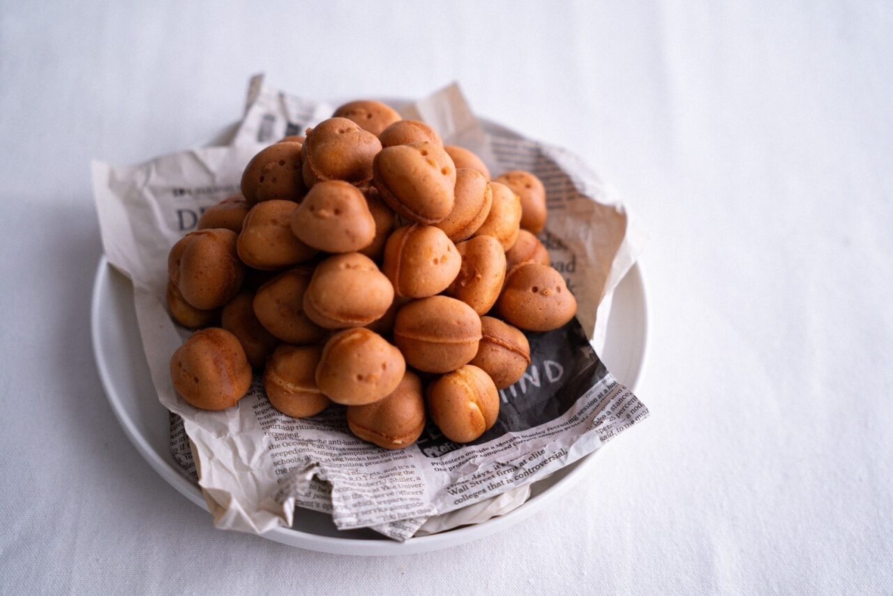 ほんのり焼き色がついて、丸っこいフォルムにちょこんと目のような模様が入っていておやつや手土産にも良さそうなお菓子ですね。