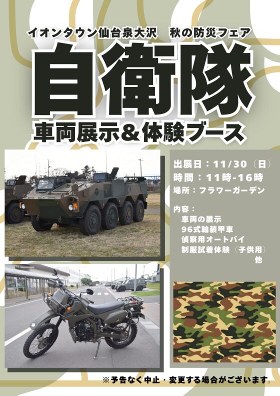 みなさん、こんにちは!11月30日(日)に大沢イオンで自衛隊の車両展示イベントがあるみたいです。