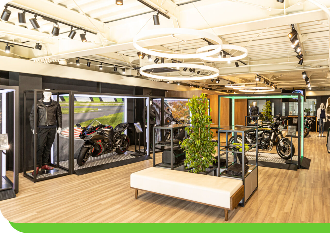カワサキモータースジャパンの正規取扱店で、「五感で楽しむ空間」がコンセプトになっているそう。