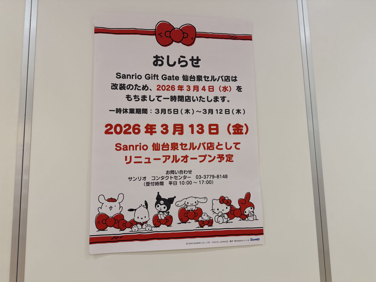 セルバの4階にあったSanrio Gift Gate仙台泉セルバ店が、Sanrio仙台泉セルバ店にリニューアルするみたいですよ。