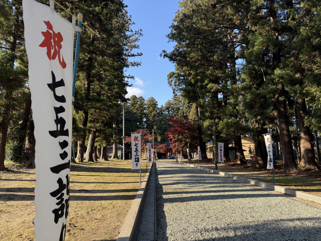 参道を進むと、両脇に七五三の旗が並んでいました。