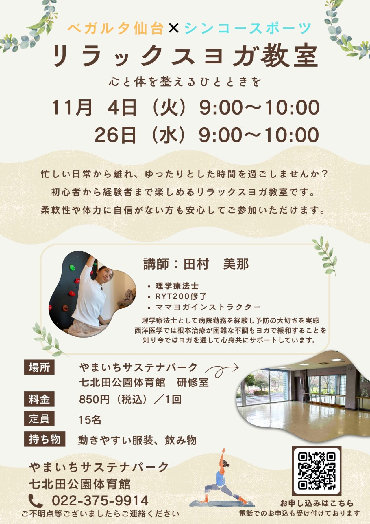 七北田公園体育館で、「リラックスヨガ教室」が行われます。