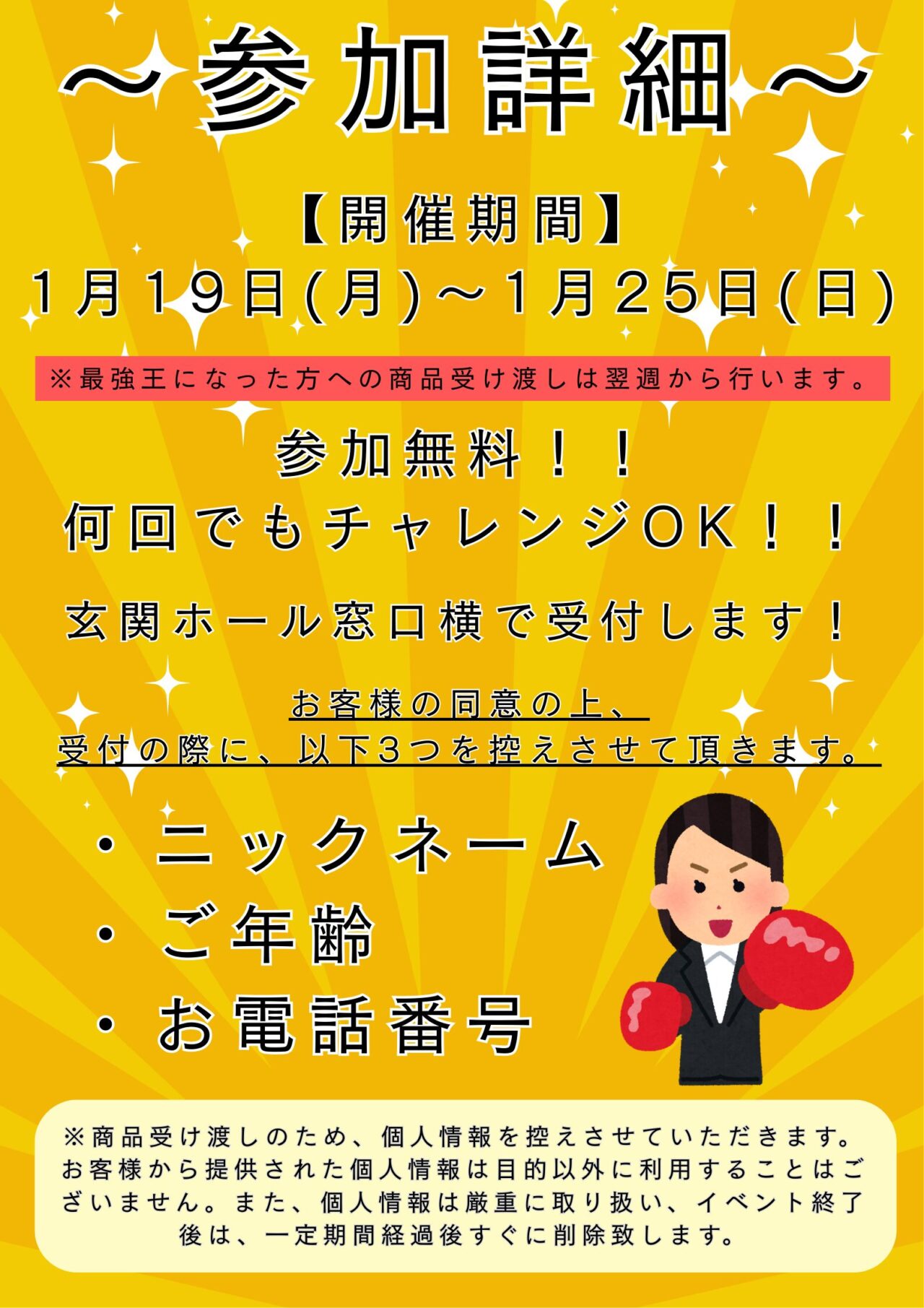 受付の際には「ニックネーム」「年齢」「電話番号」を伝える形になっていて、参加者の個人情報もちゃんと取り扱いが明記されています。