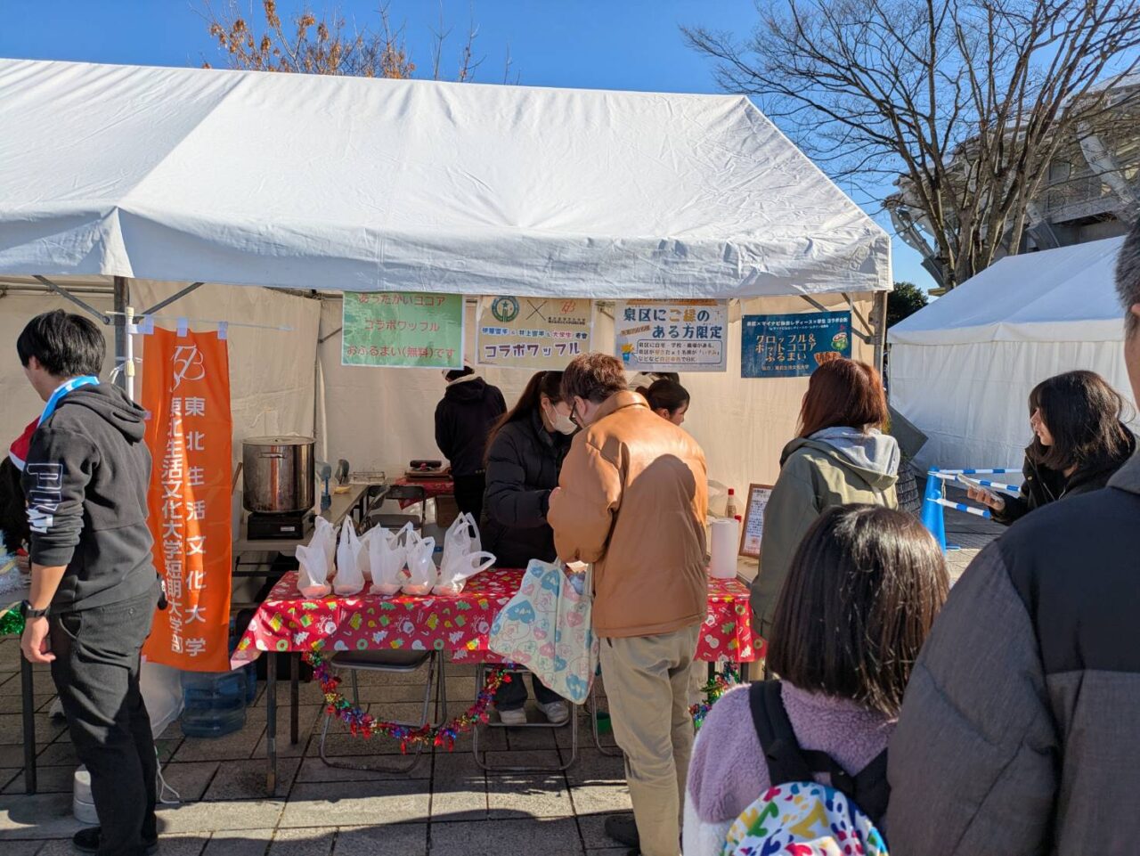 2025年12月20日、ユアスタで行われたマイナビ仙台レディースの試合会場では、スポーツ栄養サークルによるワッフルの提供や、血糖値についてのミニ啓発などが行われていました。
