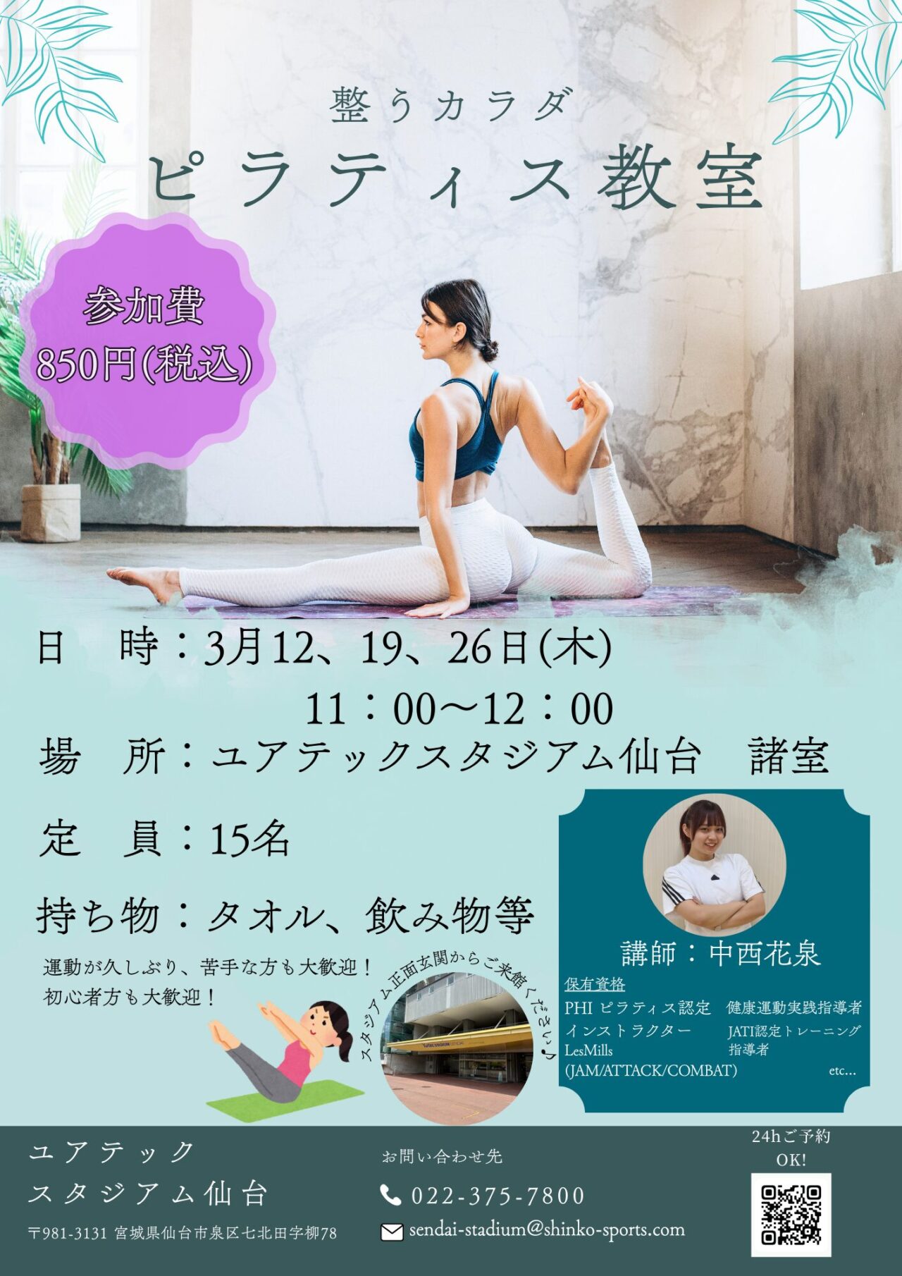 ユアテックスタジアム仙台でピラティス教室が開催されています。先月も泉区プラスで少し話題に出していましたが、3月も変わらず開催されているみたいですよ。