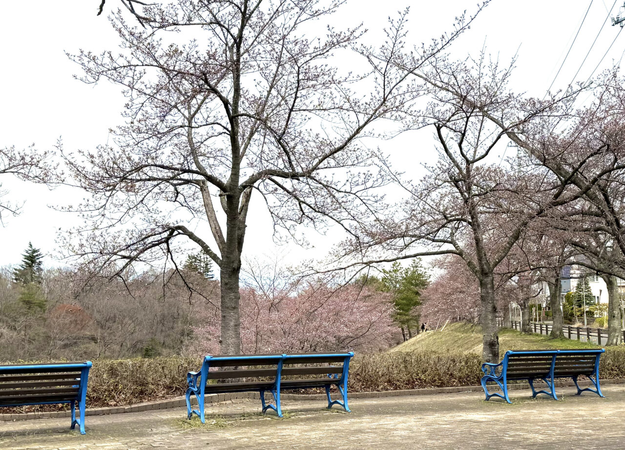この場所、座るとちょうど目線の高さに桜が広がるんですが、今は空の白さのほうがちょっと強め。