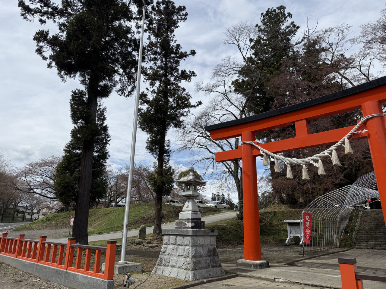 赤い鳥居と、まだ少し控えめな桜の色。この組み合わせが今の時期ならではのバランスでした。