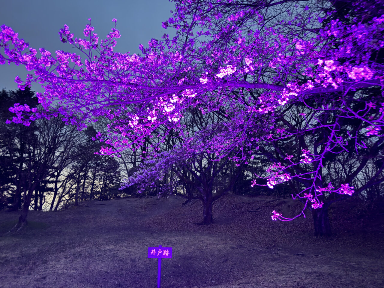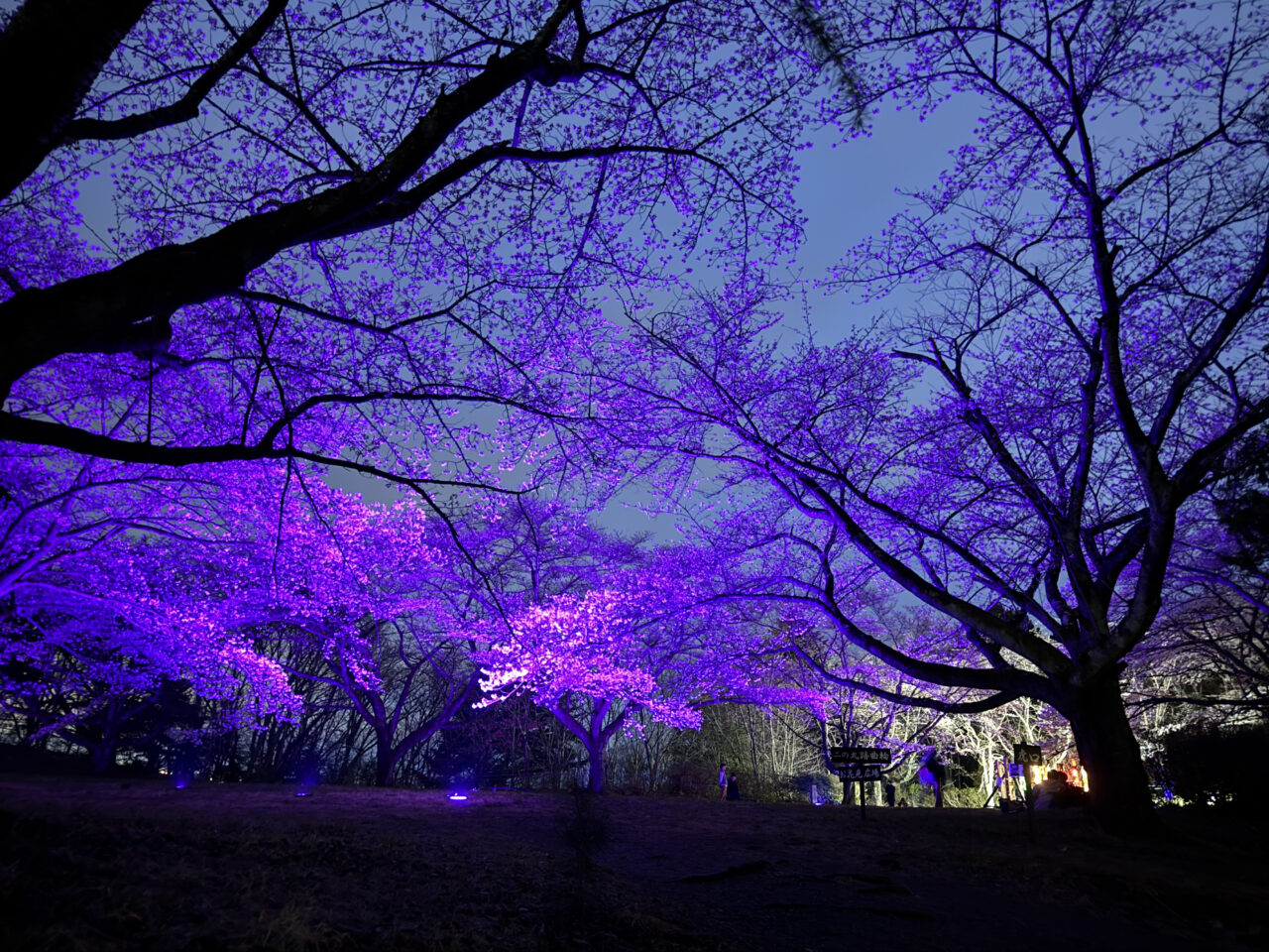 桜はちょうどいい咲き具合で、そこに紫っぽい光が当たってて、見え方がけっこう変わります。