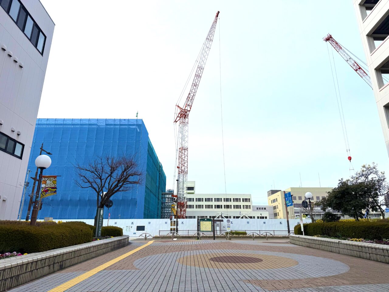 正面にクレーンが見えますが、完成するとここは広場が見えるようになるはず。