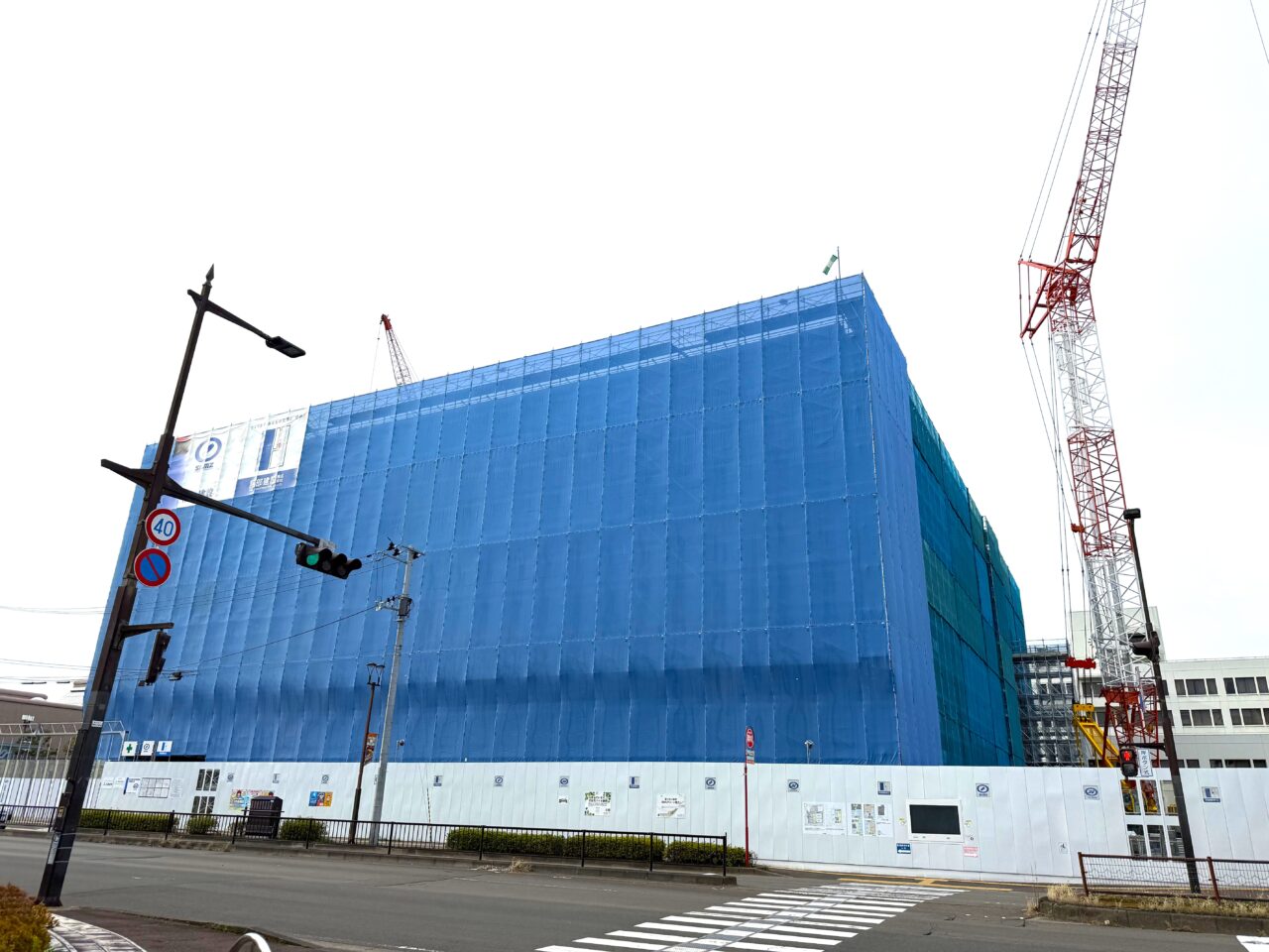 泉中央の交差点を歩いていると、視界に入ってくる“青いかたまり”。高さ的にはもう予定されている6階まで到達しています。