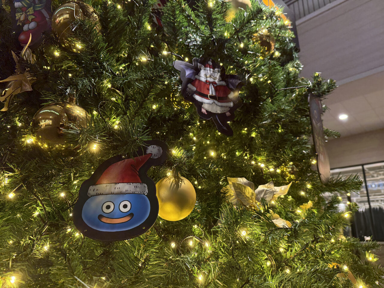 施設内にはいくつかの展示が飾られているんですが、その中にはスライムやモンスターのオーナメントがぶら下がったドラクエ仕様のクリスマスツリーも。