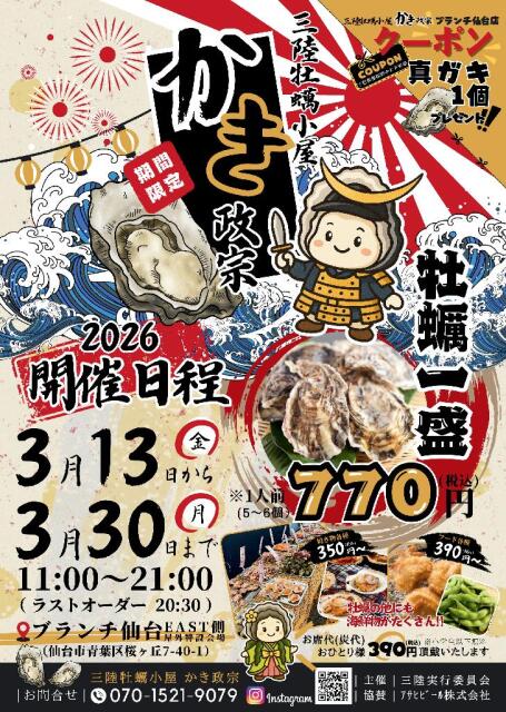 ブランチ仙台で、出張牡蠣小屋「かき政宗」が期間限定オープンするみたいです。
