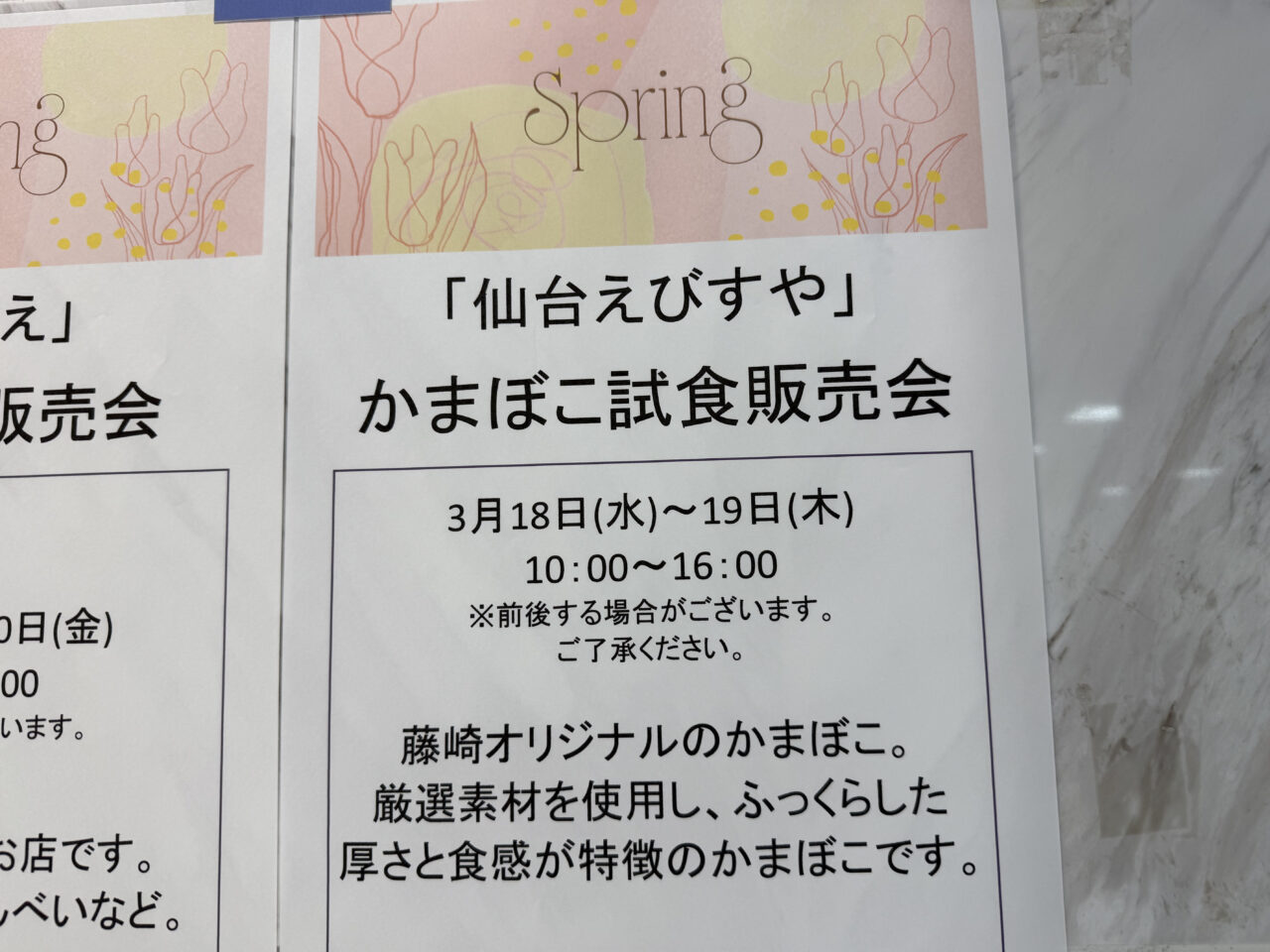 貼り紙によると、「仙台えびすや」のかまぼこ試食販売会が開催されるそうです。