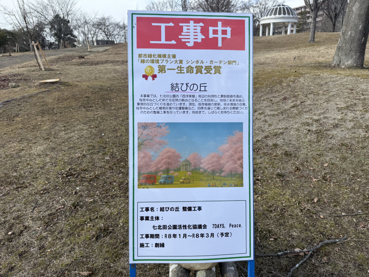 近づいてみると、掲示されていたのは「結びの丘 整備工事」の看板。